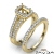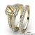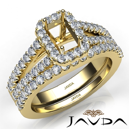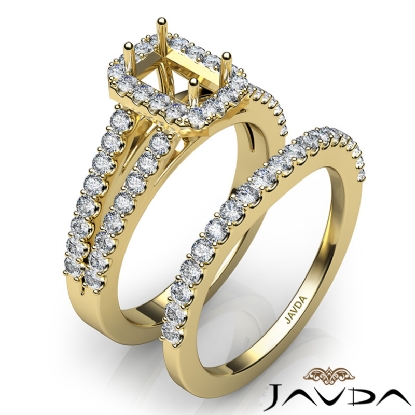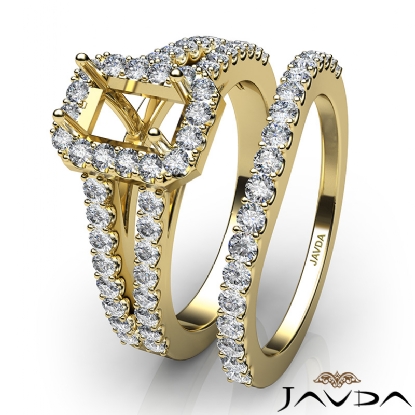 Capture your lasting love with this 18k Gold Yellow emerald semi mount bridal set showcasing a U Cut Prong set diamonds in halo and along the split shank. This engagement ring comes with a matching band. (1.25Ct. tw.)