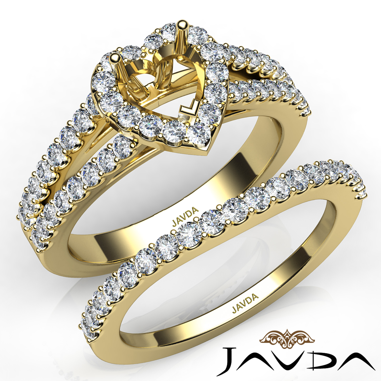 Capture your lasting love with this 18k Gold Yellow heart semi mount bridal set showcasing a U Cut Prong set diamonds in halo and along the split shank. This engagement ring comes with a matching band. (1.25Ct. tw.)