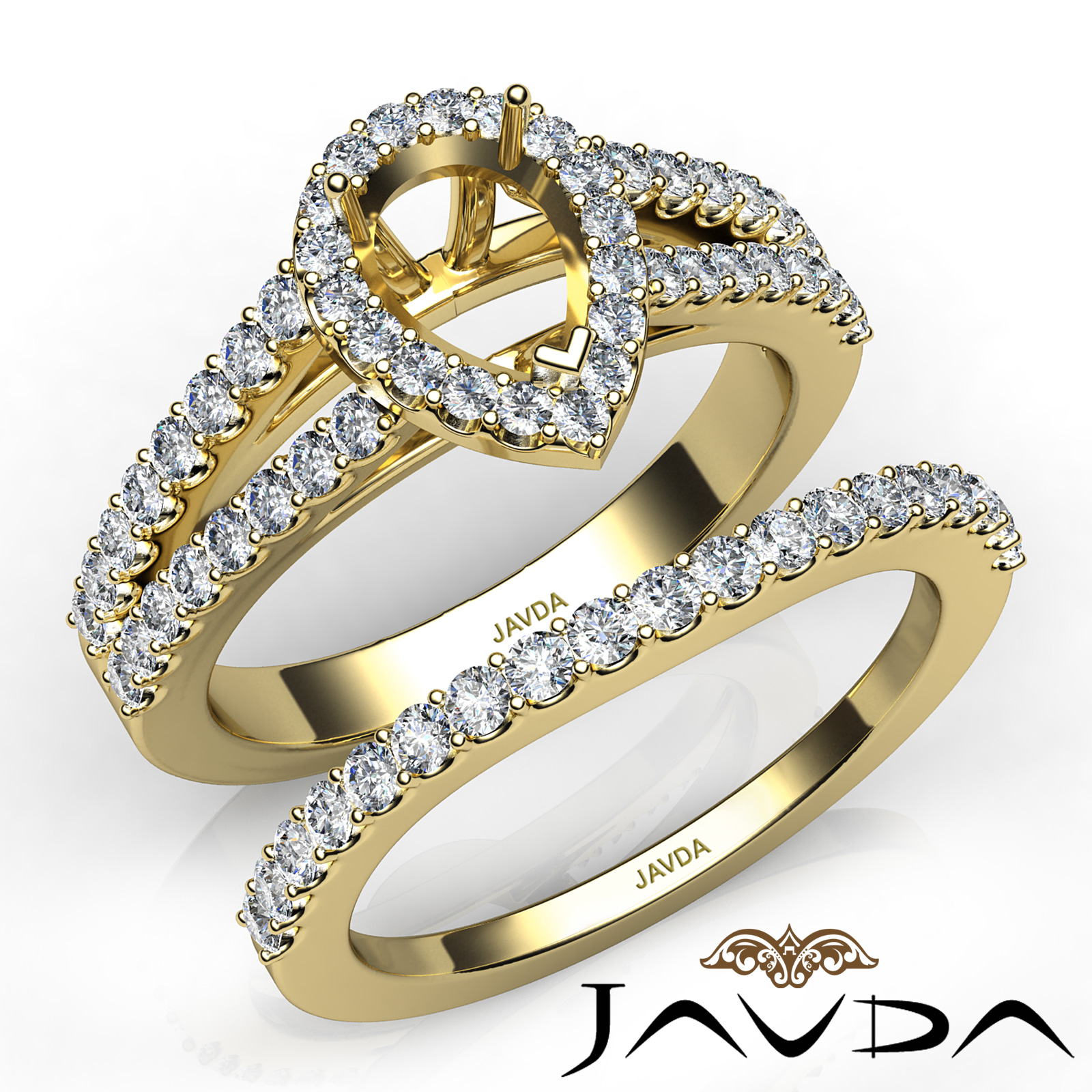 Capture your lasting love with this 14k Gold Yellow pear semi mount bridal set showcasing a U Cut Prong set diamonds in halo and along the split shank. This engagement ring comes with a matching band. (1.25Ct. tw.)
