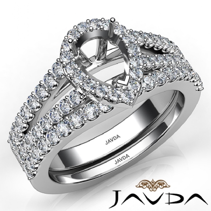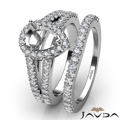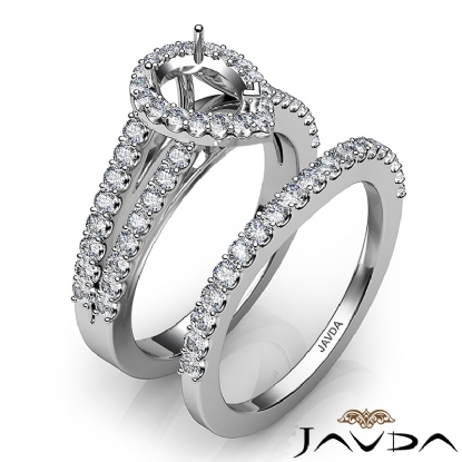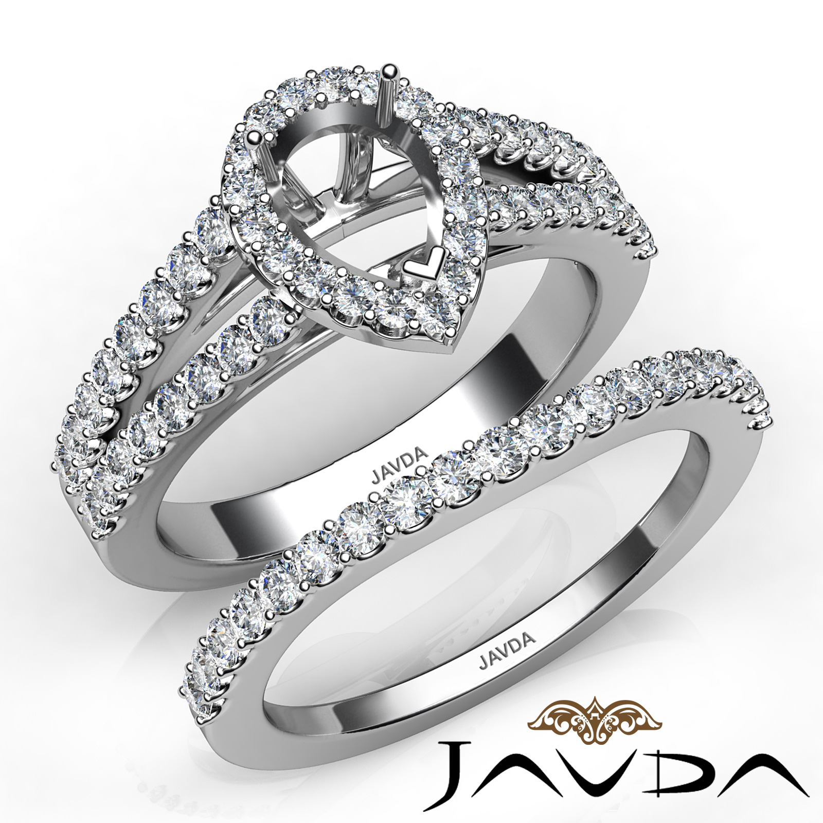 Capture your lasting love with this 18k Gold White pear semi mount bridal set showcasing a U Cut Prong set diamonds in halo and along the split shank. This engagement ring comes with a matching band. (1.25Ct. tw.)