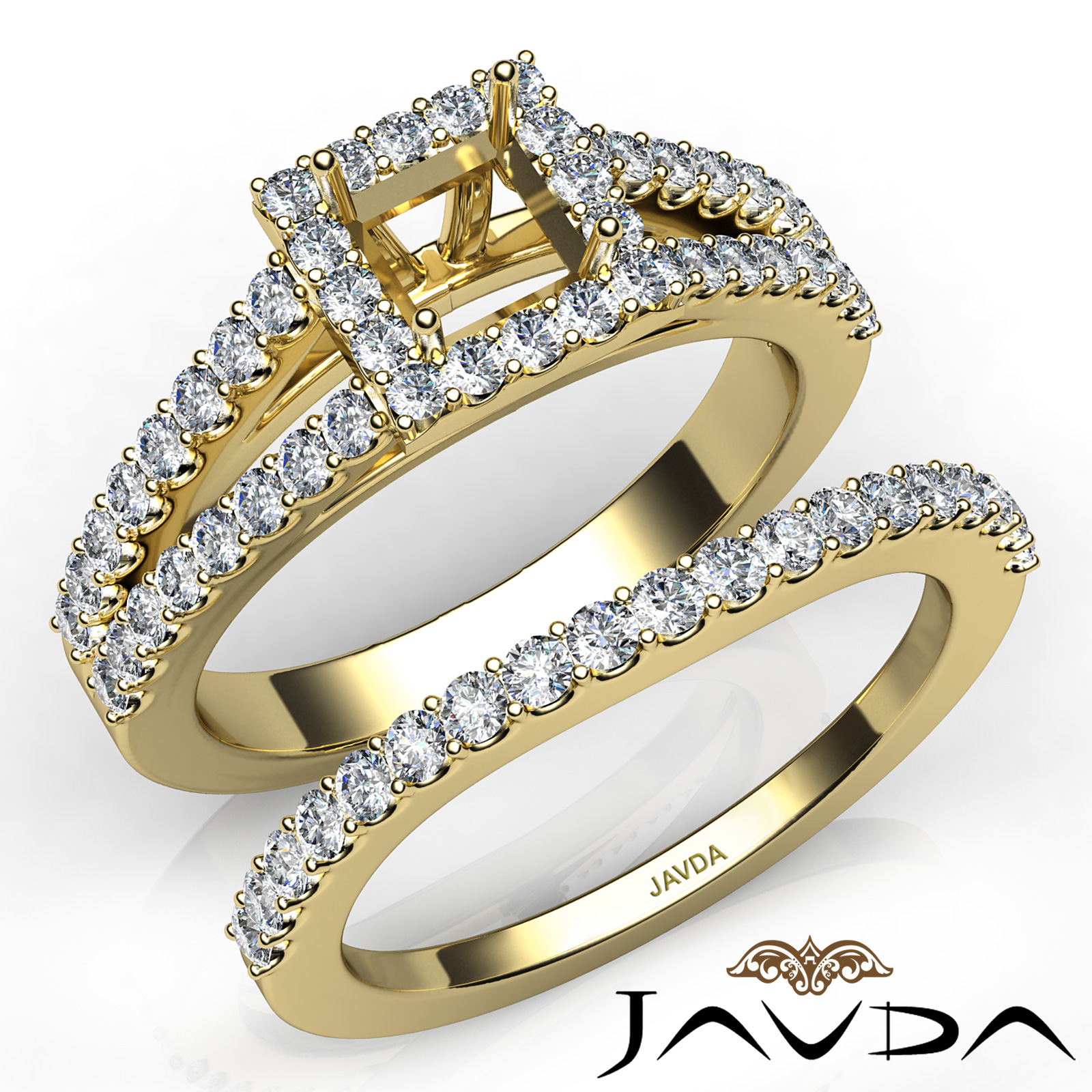 Capture your lasting love with this 18k Gold Yellow princess semi mount bridal set showcasing a U Cut Prong set diamonds in halo and along the split shank. This engagement ring comes with a matching band. (1.25Ct. tw.)