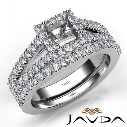 Capture your lasting love with this Platinum 950 princess semi mount bridal set showcasing a U Cut Prong set diamonds in halo and along the split shank. This engagement ring comes with a matching band. (1.25Ct. tw.)