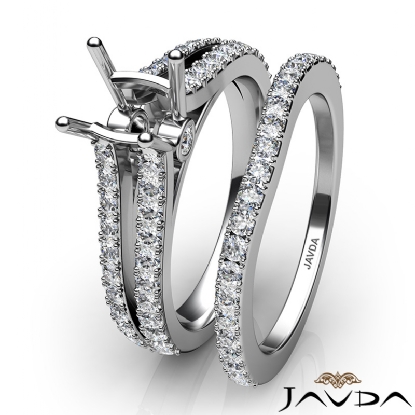 This 18k Gold White cushion semi mount engagement ring and matching band. This bridal set features of round prong set diamonds along the spectacular split shank, making it perfect for the occasion. (1.1Ct. tw.)