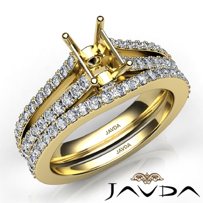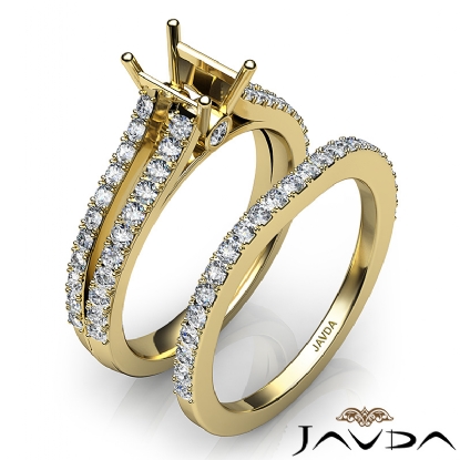 This 18k Gold Yellow emerald semi mount engagement ring and matching band. This bridal set features of round prong set diamonds along the spectacular split shank, making it perfect for the occasion. (1.1Ct. tw.)
