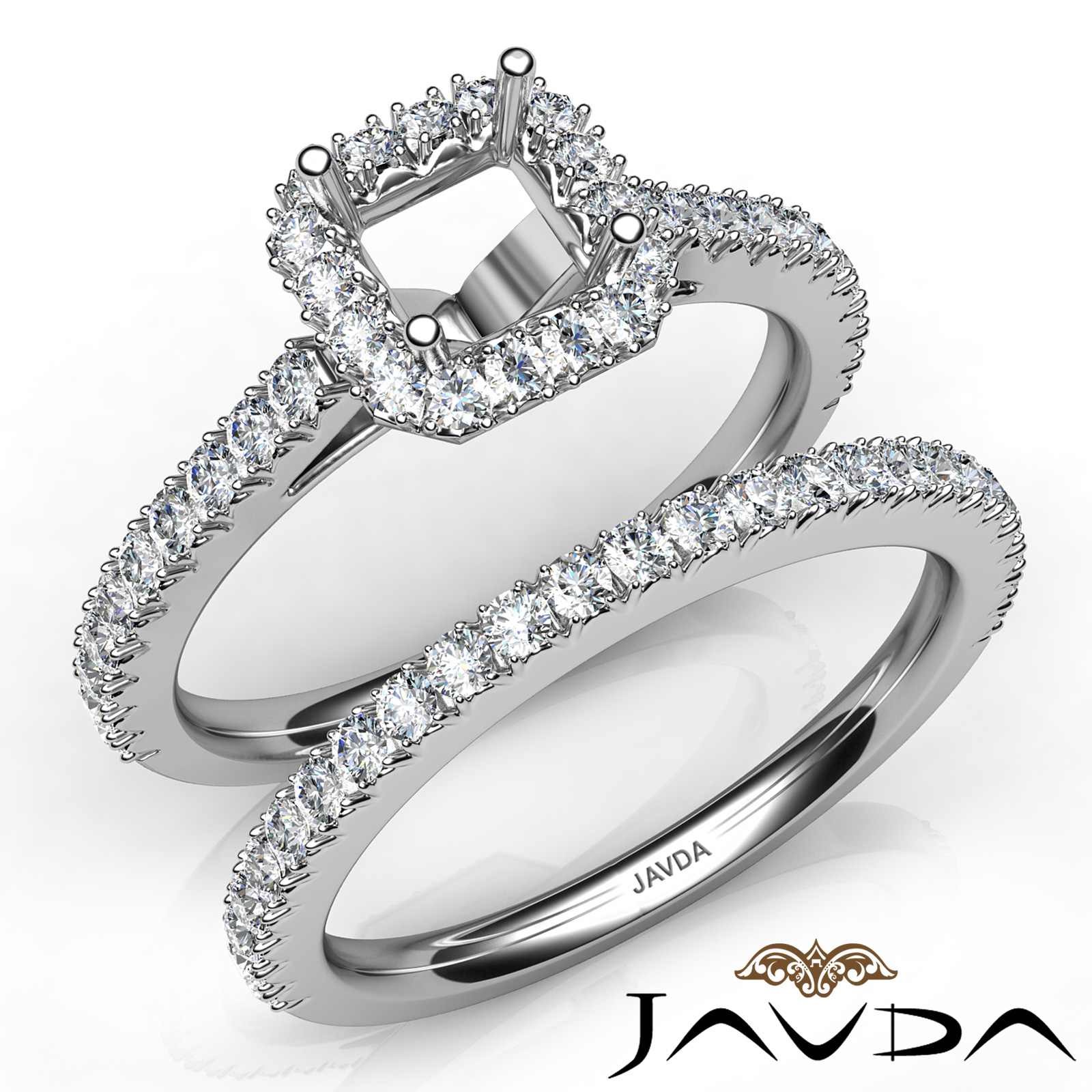 Gorgeous with a touch of vintage, this Platinum 950 semi mount asscher engagement ring and matching band, features french cut pave round set diamonds. This bridal set weighs . (1.5Ct. tw.)