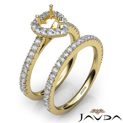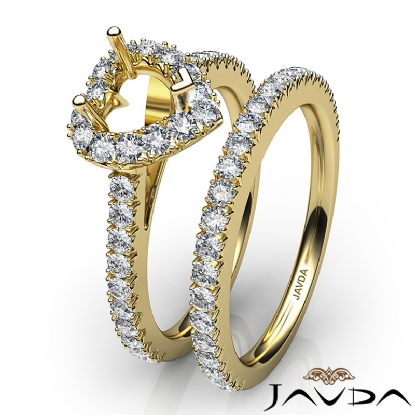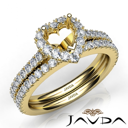 Gorgeous with a touch of vintage, this 18k Gold Yellow semi mount heart engagement ring and matching band, features french cut pave round set diamonds. This bridal set weighs . (1.5Ct. tw.)