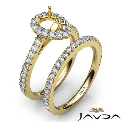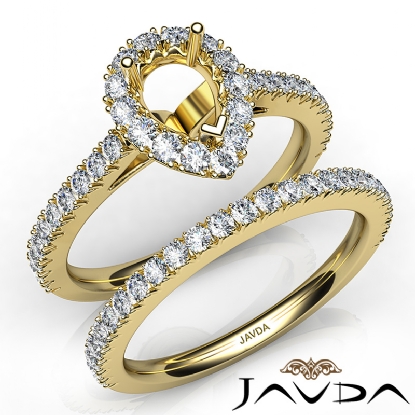 Gorgeous with a touch of vintage, this 14k Gold Yellow semi mount pear engagement ring and matching band, features french cut pave round set diamonds. This bridal set weighs . (1.5Ct. tw.)