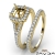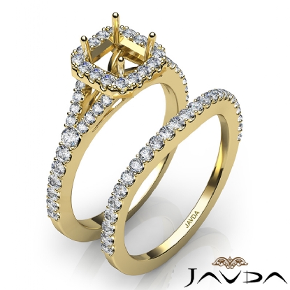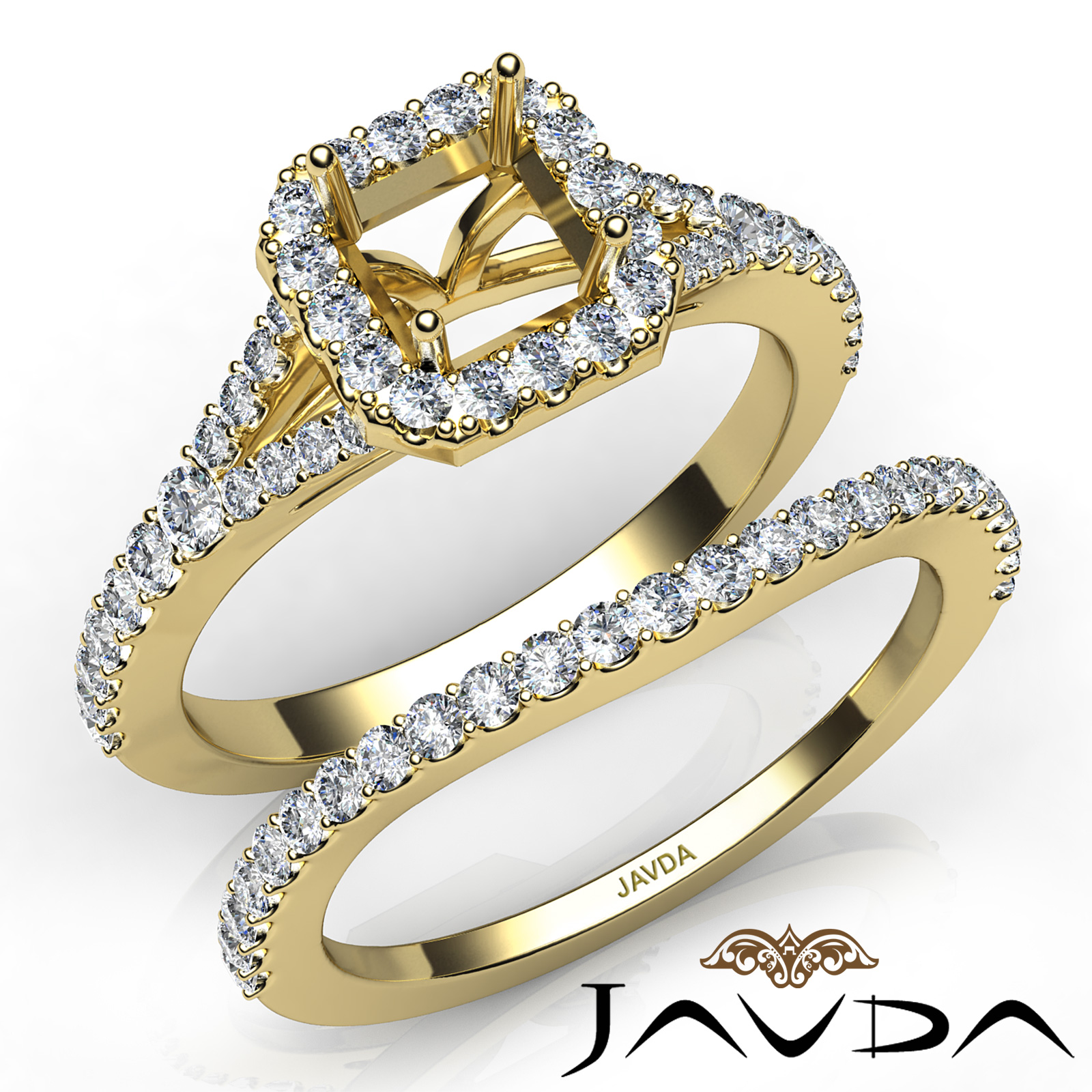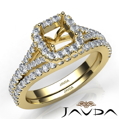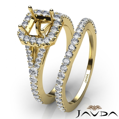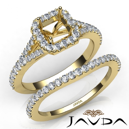 Gorgeous! This bridal set is such a stunner! It consists of a asscher semi mount engagement ring and a matching band, featuring U cut Prong set diamonds on halo and the shank. This beautiful diamond set is made in 14k Gold Yellow. (0.8Ct. tw.)