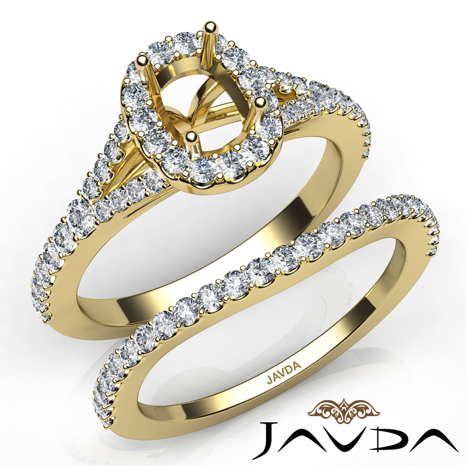 Gorgeous! This bridal set is such a stunner! It consists of a cushion semi mount engagement ring and a matching band, featuring U cut Prong set diamonds on halo and the shank. This beautiful diamond set is made in 14k Gold Yellow. (0.8Ct. tw.)