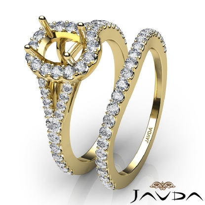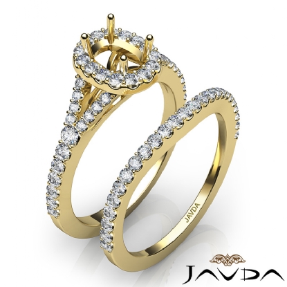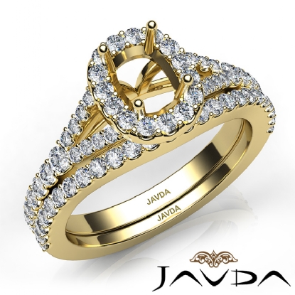 Gorgeous! This bridal set is such a stunner! It consists of a cushion semi mount engagement ring and a matching band, featuring U cut Prong set diamonds on halo and the shank. This beautiful diamond set is made in 18k Gold Yellow. (0.8Ct. tw.)