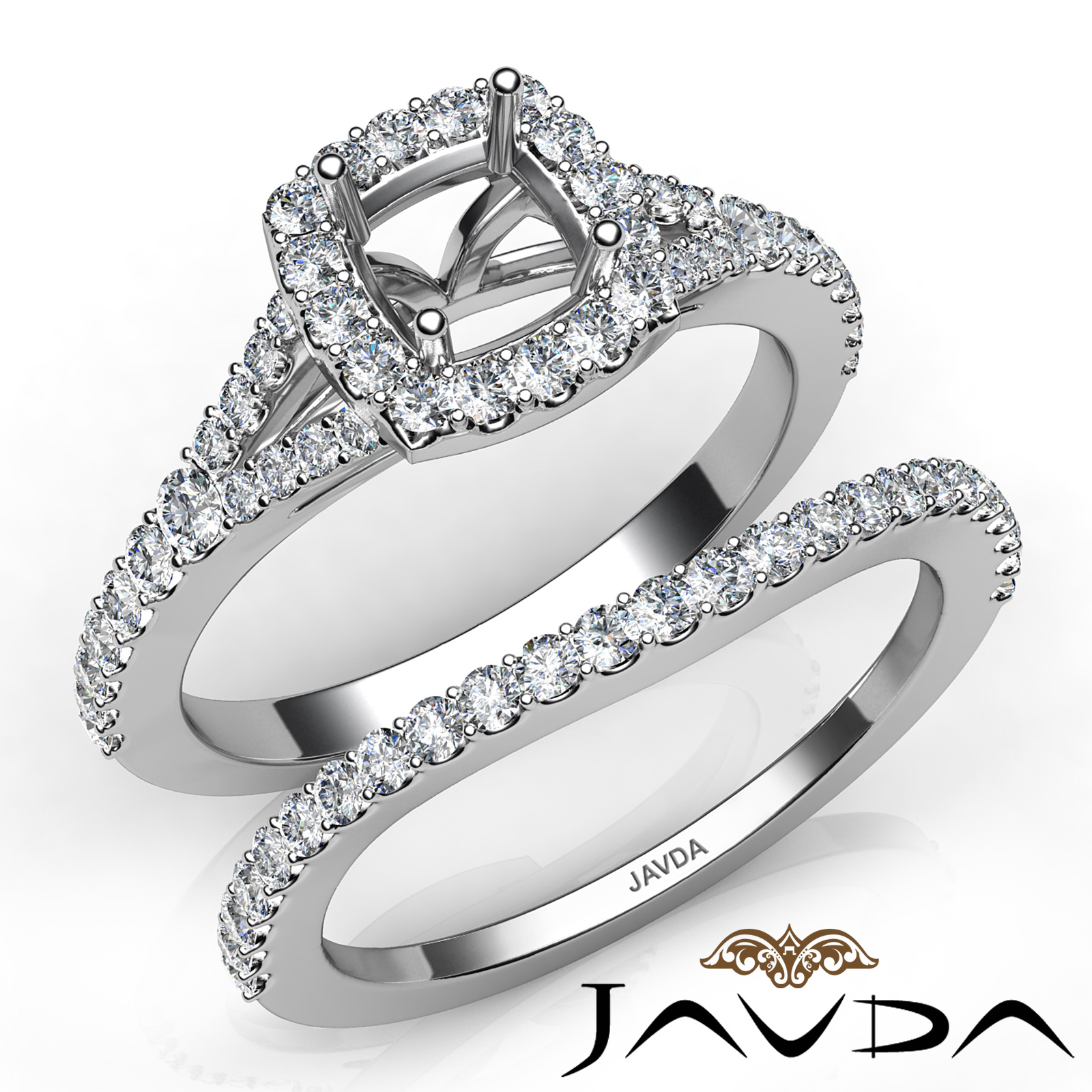 Gorgeous! This bridal set is such a stunner! It consists of a cushion cut semi mount engagement ring and a matching band, featuring U cut Prong set diamonds on halo and the shank. This beautiful diamond set is made in Platinum 950. (0.8Ct. tw.)