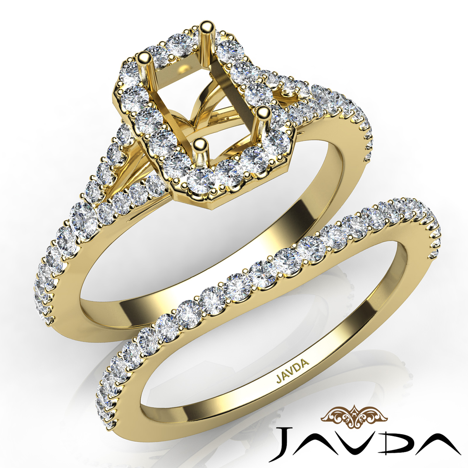 Gorgeous! This bridal set is such a stunner! It consists of a emerald semi mount engagement ring and a matching band, featuring U cut Prong set diamonds on halo and the shank. This beautiful diamond set is made in 14k Gold Yellow. (0.8Ct. tw.)