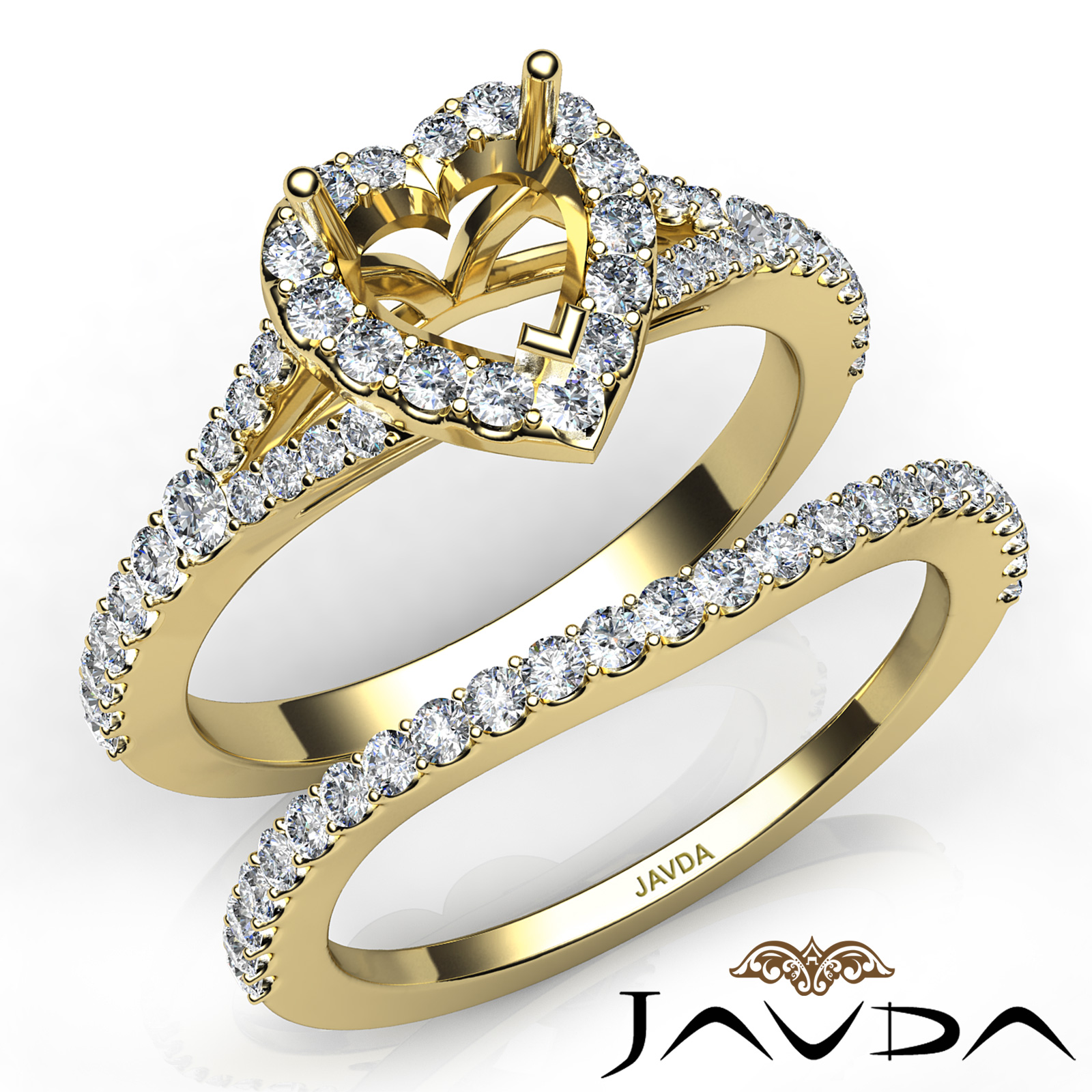Gorgeous! This bridal set is such a stunner! It consists of a heart semi mount engagement ring and a matching band, featuring U cut Prong set diamonds on halo and the shank. This beautiful diamond set is made in 14k Gold Yellow. (0.8Ct. tw.)