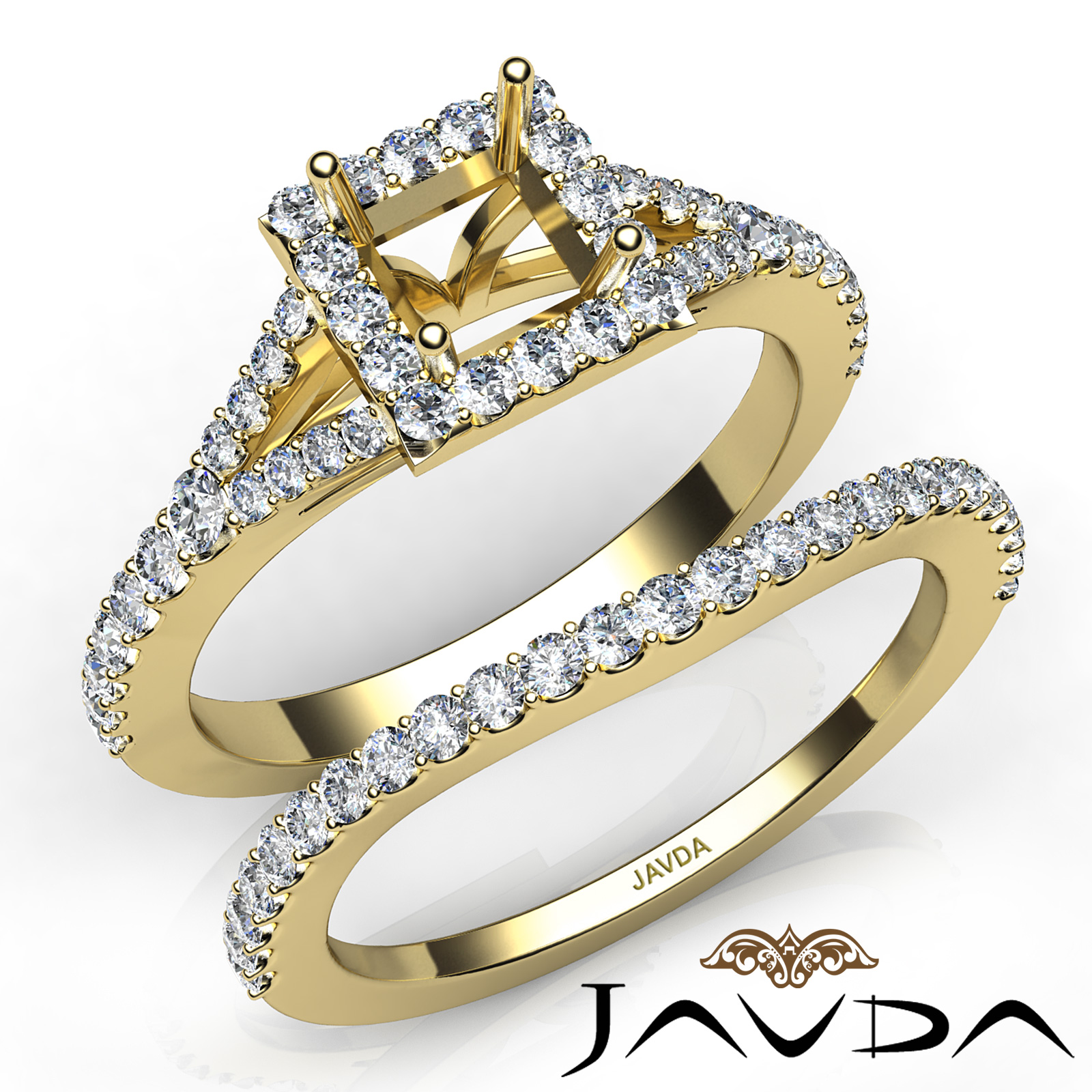 Gorgeous! This bridal set is such a stunner! It consists of a princess semi mount engagement ring and a matching band, featuring U cut Prong set diamonds on halo and the shank. This beautiful diamond set is made in 14k Gold Yellow. (0.8Ct. tw.)