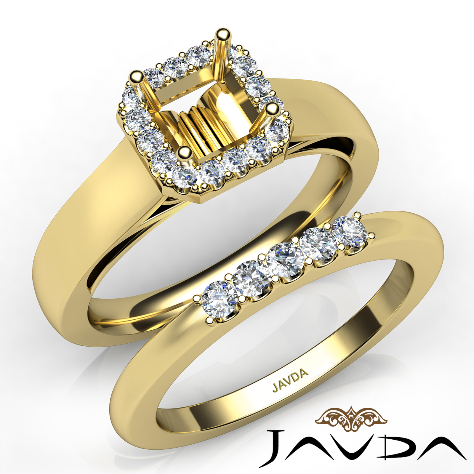 This Magnificent engagement ring and matching band feature an asscher semi mount in Halo U Cut prong setting diamonds on shank also. This . bridal set is crafted in 18k Gold Yellow. (0.42Ct. tw.)