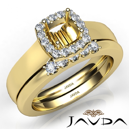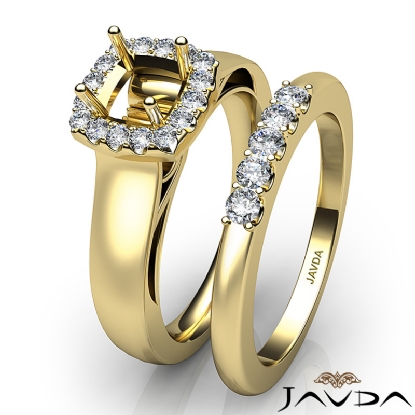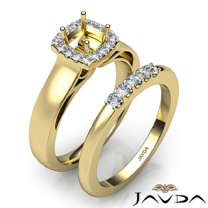 This Magnificent engagement ring and matching band feature an cushion cut semi mount in Halo U Cut prong setting diamonds on shank also. This bridal set is crafted in 14k Gold Yellow. (0.4Ct. tw.)