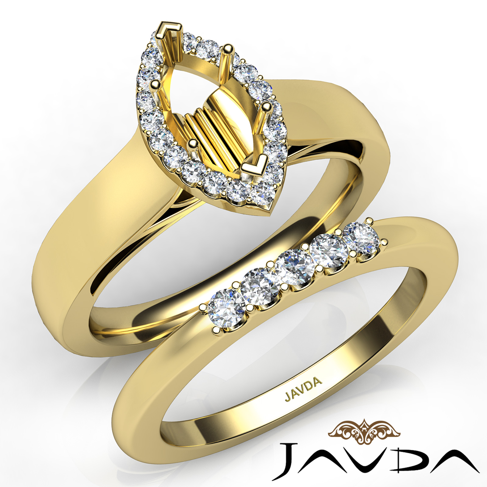 This Magnificent engagement ring and matching band feature an marquise semi mount in Halo U Cut prong setting diamonds on shank also. This bridal set is crafted in 18k Gold Yellow. (0.45Ct. tw.)