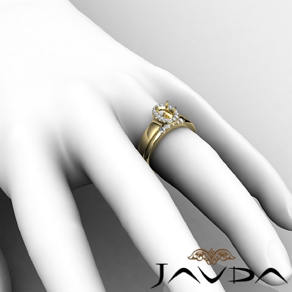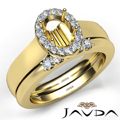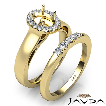 This Magnificent engagement ring and matching band feature an oval semi mount in Halo U Cut prong setting diamonds on shank also. This bridal set is crafted in 18k Gold Yellow. (0.43Ct. tw.)