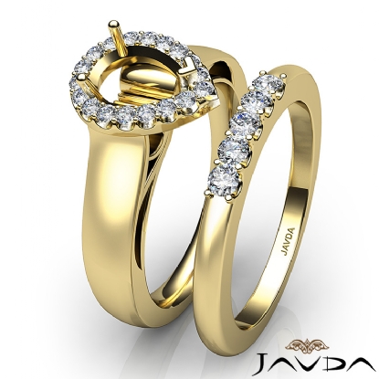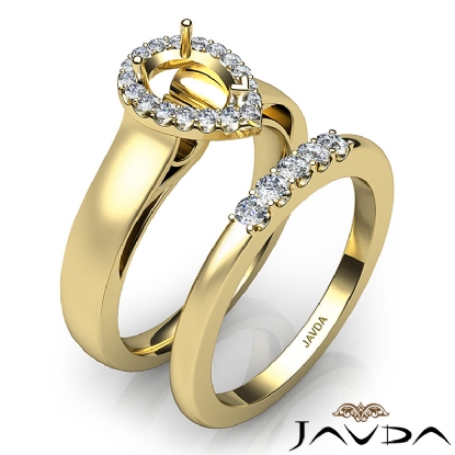 This Magnificent engagement ring and matching band feature an pear semi mount in Halo U Cut prong setting diamonds on shank also. This bridal set is crafted in 18k Gold Yellow. (0.43Ct. tw.)