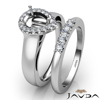This Magnificent engagement ring and matching band feature an pear semi mount in Halo U Cut prong setting diamonds on shank also. This bridal set is crafted in Platinum 950. (0.43Ct. tw.)