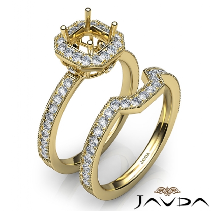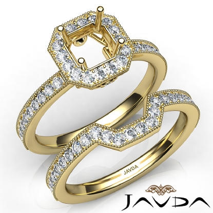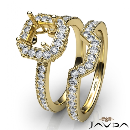 Intricately designed, this milgrain asscher semi mount engagement ring and wedding band features round halo pave set diamonds along the shank. Made in 14k Gold Yellow, this bridal set is truly beautiful. (1Ct. tw.)