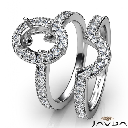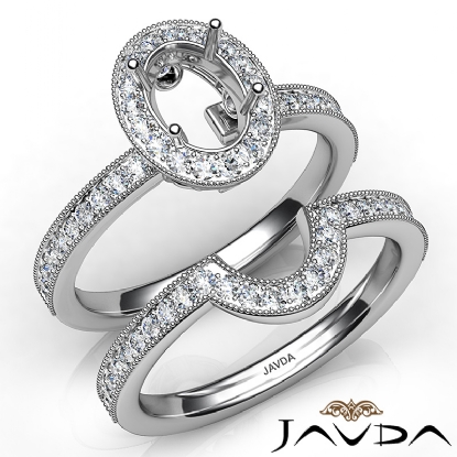 Intricately designed, this milgrain oval semi mount engagement ring and wedding band features round halo pave set diamonds along the shank. Made in 18k Gold White, this bridal set is truly beautiful. (1Ct. tw.)