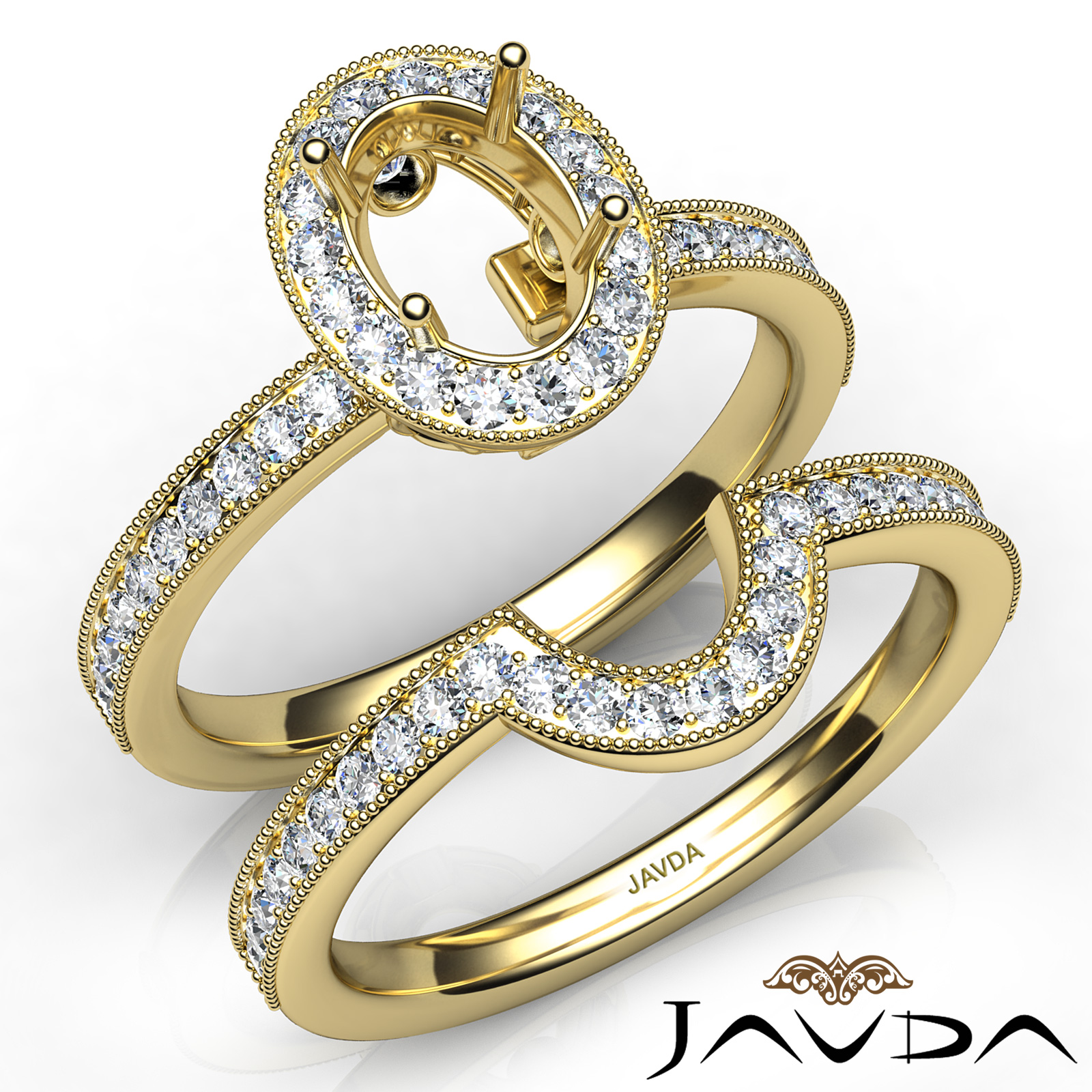 Intricately designed, this milgrain oval semi mount engagement ring and wedding band features round halo pave set diamonds along the shank. Made in 18k Gold Yellow, this bridal set is truly beautiful. (1Ct. tw.)