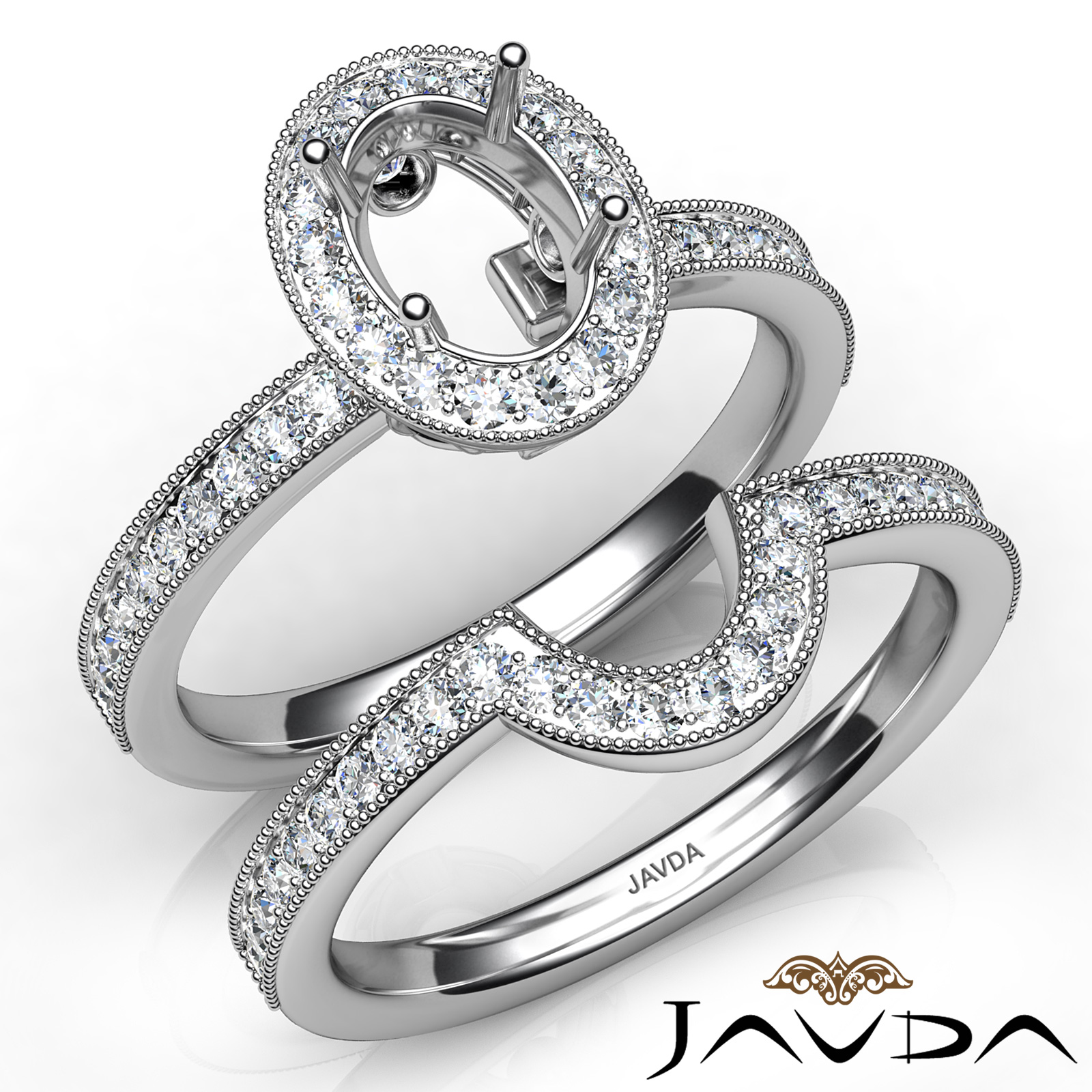 Intricately designed, this milgrain oval semi mount engagement ring and wedding band features round halo pave set diamonds along the shank. Made in Platinum 950, this bridal set is truly beautiful. (1Ct. tw.)