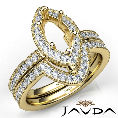 Intricately designed, this milgrain marquise semi mount engagement ring and wedding band features round halo pave set diamonds along the shank. Made in 18k Gold Yellow, this bridal set is truly beautiful. (1Ct. tw.)