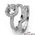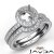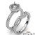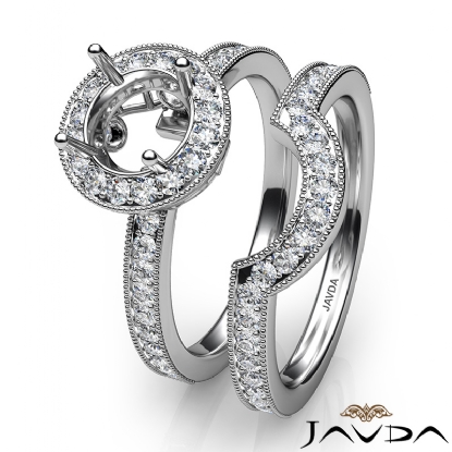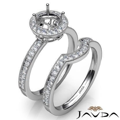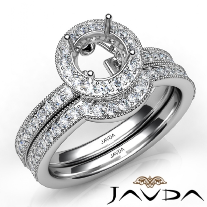 Intricately designed, this milgrain round semi mount engagement ring and wedding band features round halo pave set diamonds along the shank. Made in 18k Gold White, this bridal set is truly beautiful. (1Ct. tw.)