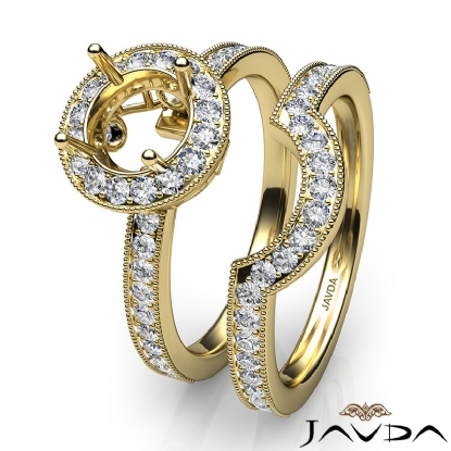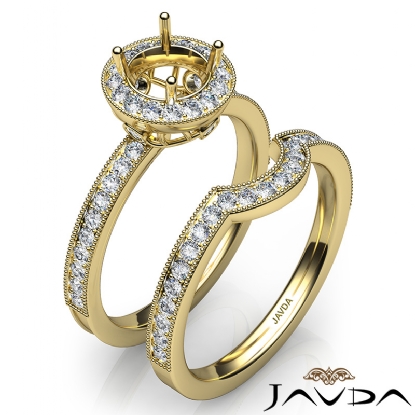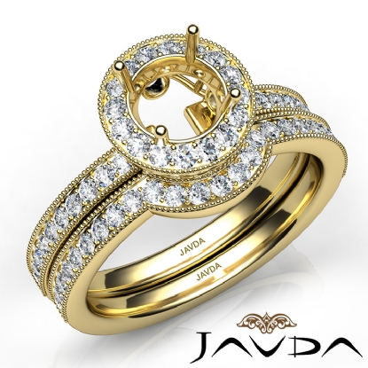 Intricately designed, this milgrain round semi mount engagement ring and wedding band features round halo pave set diamonds along the shank. Made in 18k Gold Yellow, this bridal set is truly beautiful. (1Ct. tw.)