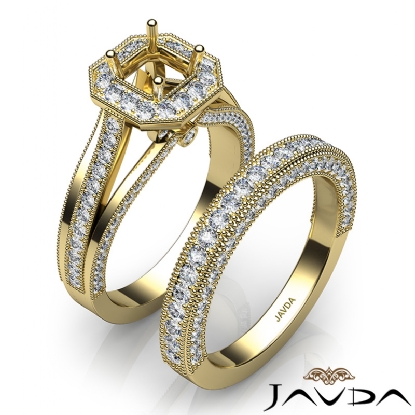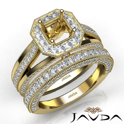 Classic in design, this asscher semi mount engagement milgrain ring and women's wedding band features round halo pave set diamonds in halo and along the pretty shank. This bridal set is crafted in 18k Gold Yellow. (1.7Ct. tw.)