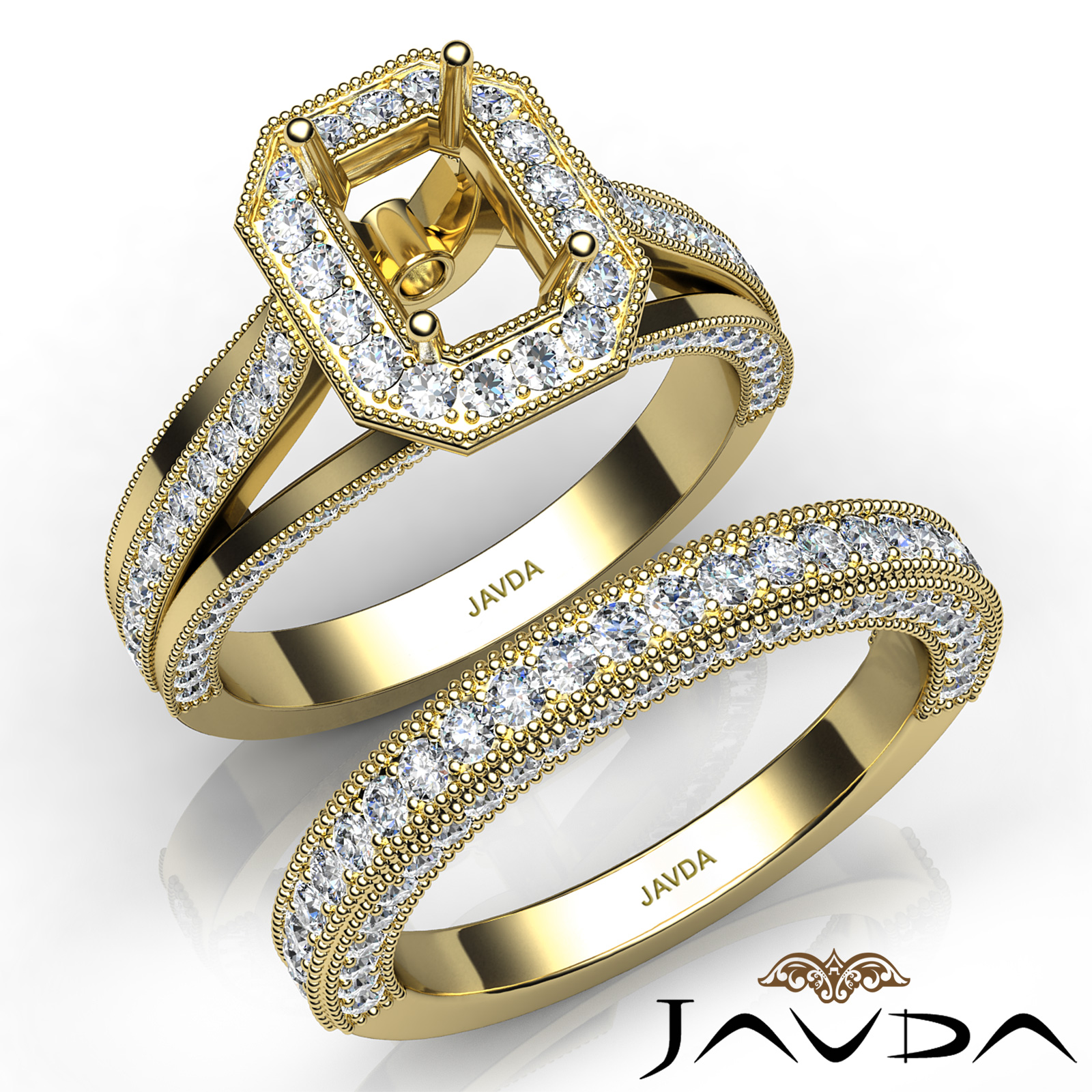 Classic in design, this emerald semi mount engagement milgrain ring and women's wedding band features round halo pave set diamonds in halo and along the pretty shank. This bridal set is crafted in 18k Gold Yellow. (1.7Ct. tw.)