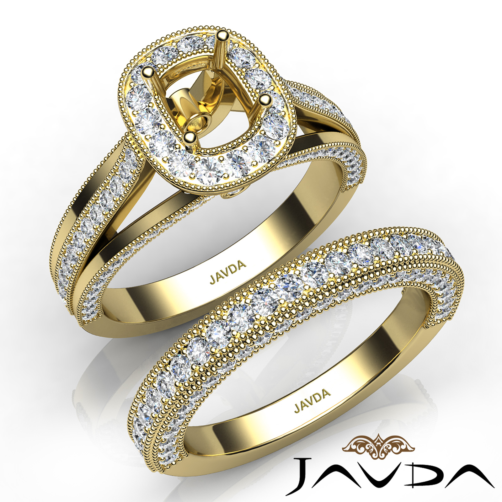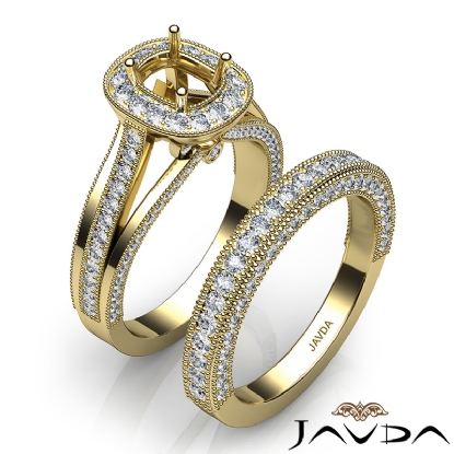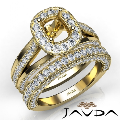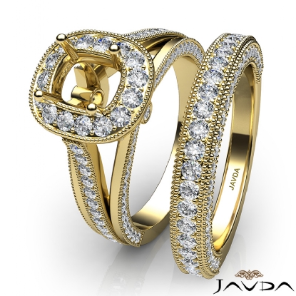 Classic in design, this cushion semi mount engagement milgrain ring and women's wedding band features round halo pave set diamonds in halo and along the pretty shank. This bridal set is crafted in 14k Gold Yellow. (1.7Ct. tw.)