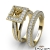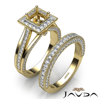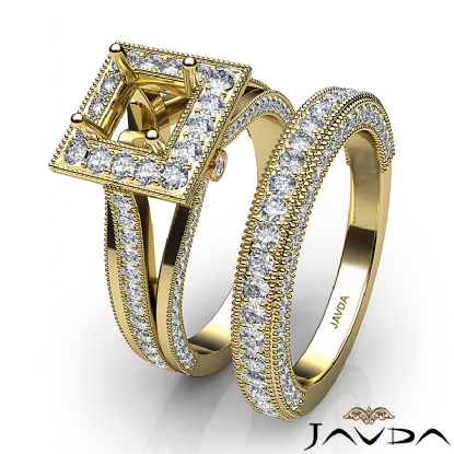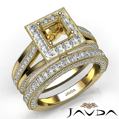 Classic in design, this princess semi mount engagement milgrain ring and women's wedding band features round halo pave set diamonds in halo and along the pretty shank. This bridal set is crafted in 14k Gold Yellow. (1.7Ct. tw.)