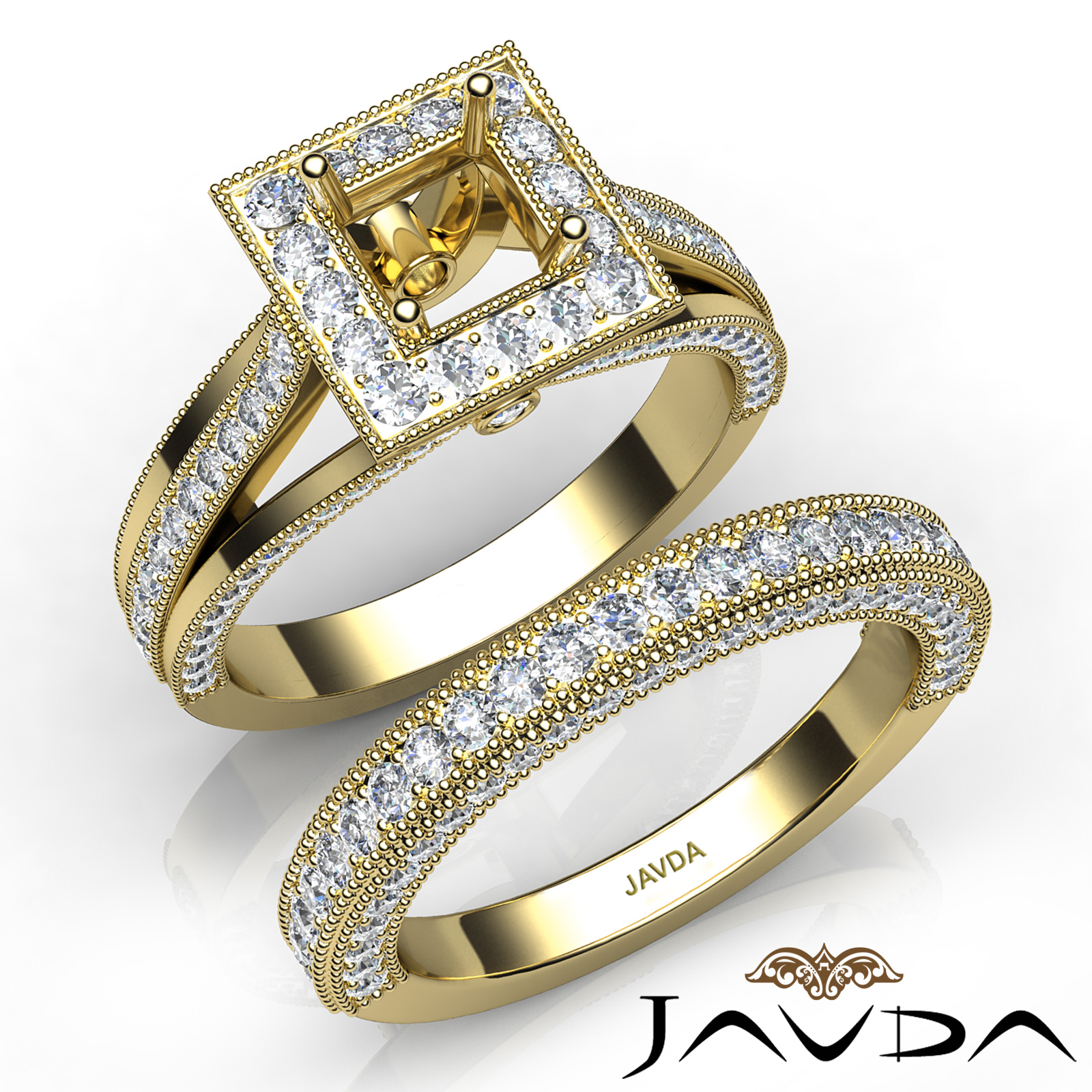 Classic in design, this princess semi mount engagement milgrain ring and women's wedding band features round halo pave set diamonds in halo and along the pretty shank. This bridal set is crafted in 18k Gold Yellow. (1.7Ct. tw.)
