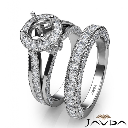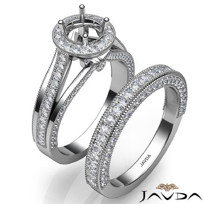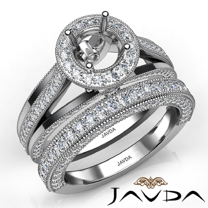 Classic in design, this round semi mount engagement milgrain ring and women's wedding band features round halo pave set diamonds in halo and along the pretty shank. This bridal set is crafted in 18k Gold White. (1.7Ct. tw.)