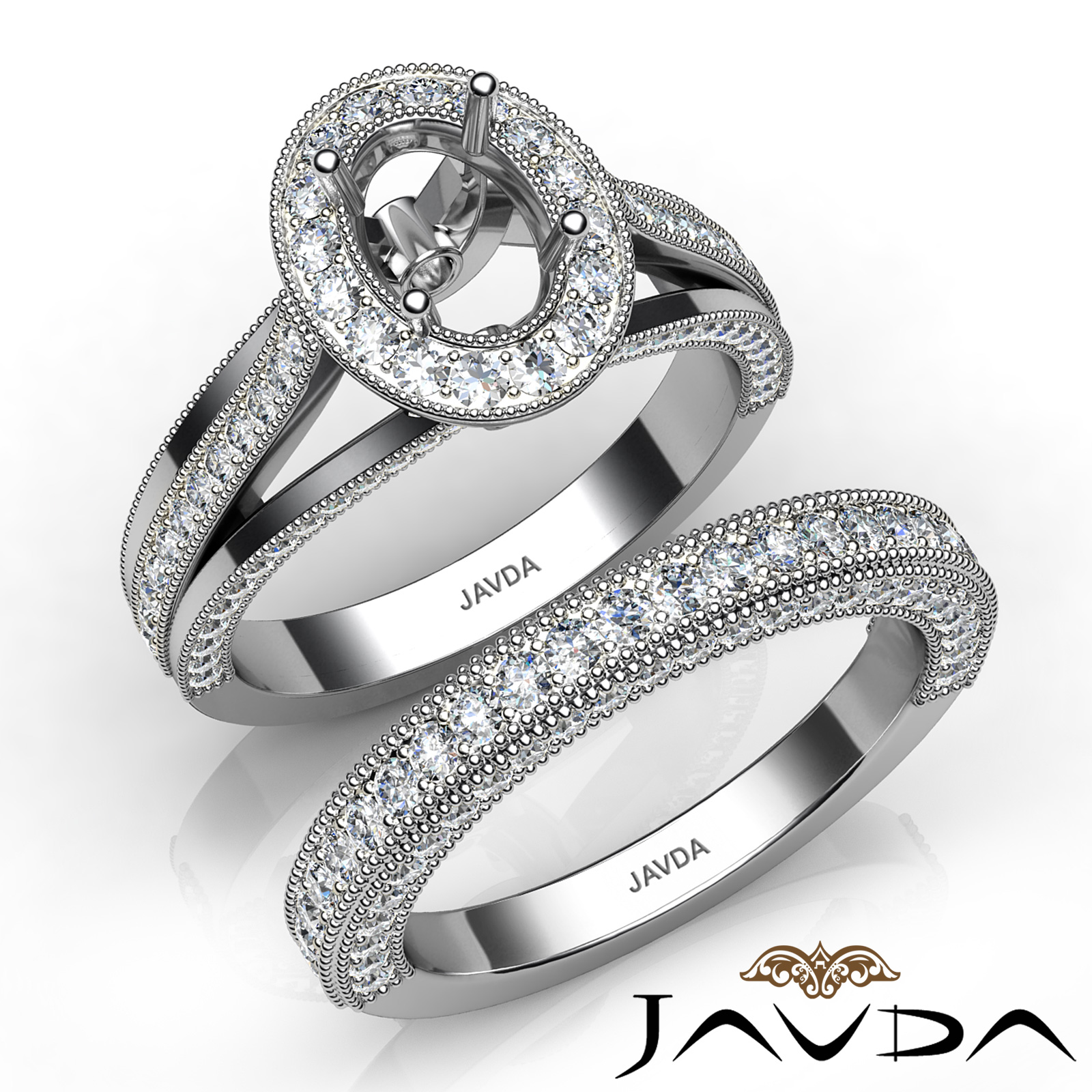 Classic in design, this oval semi mount engagement milgrain ring and women's wedding band features round halo pave set diamonds in halo and along the pretty shank. This bridal set is crafted in Platinum 950. (1.7Ct. tw.)