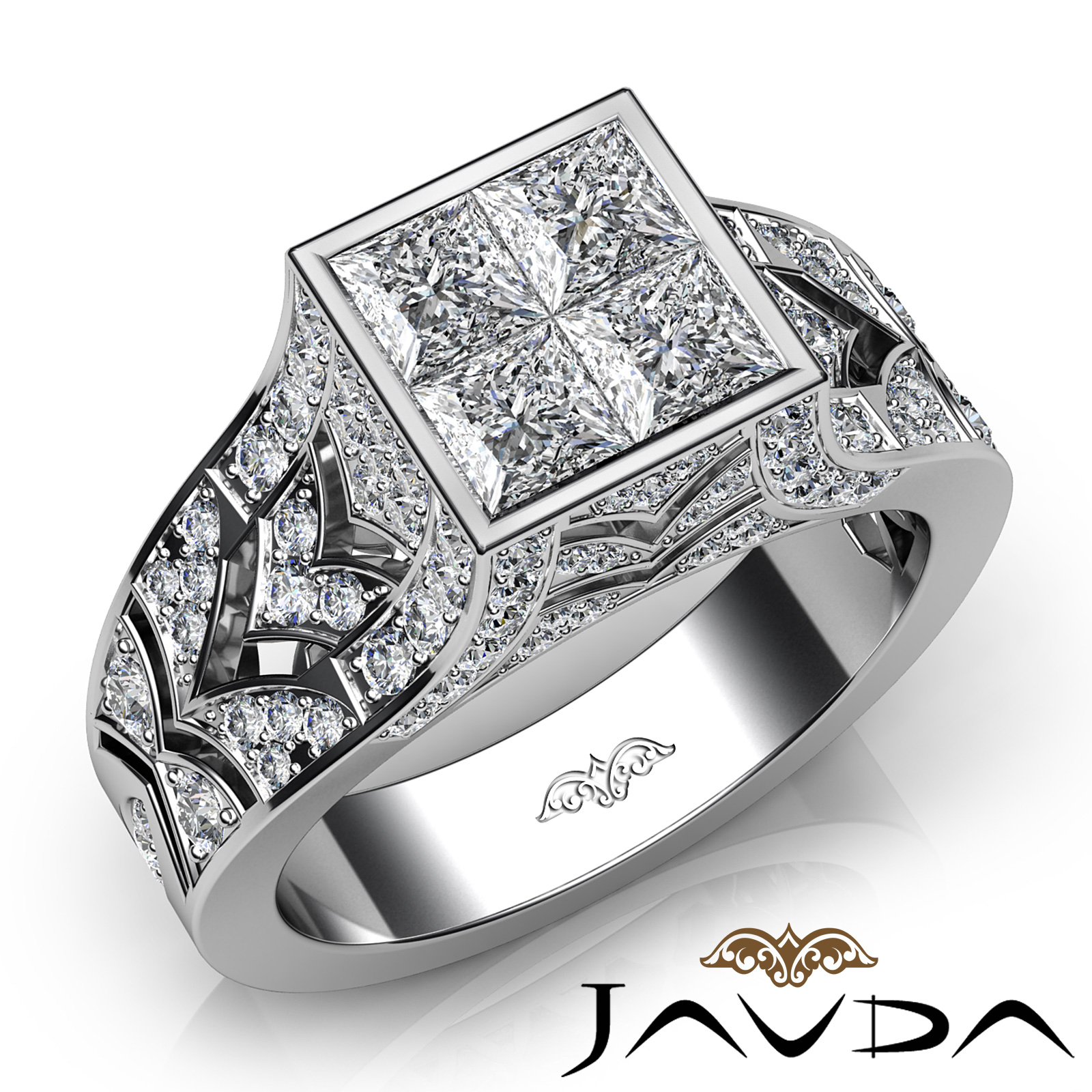 Enhance your style with the eye-catching look of this . anniversary diamond ring made in 18k Gold White. It features a 4 princess center Diamond, with dazzling Round pave set diamonds beautifully placed along the shank. (1.7Ct. tw.)