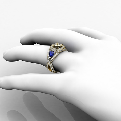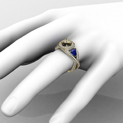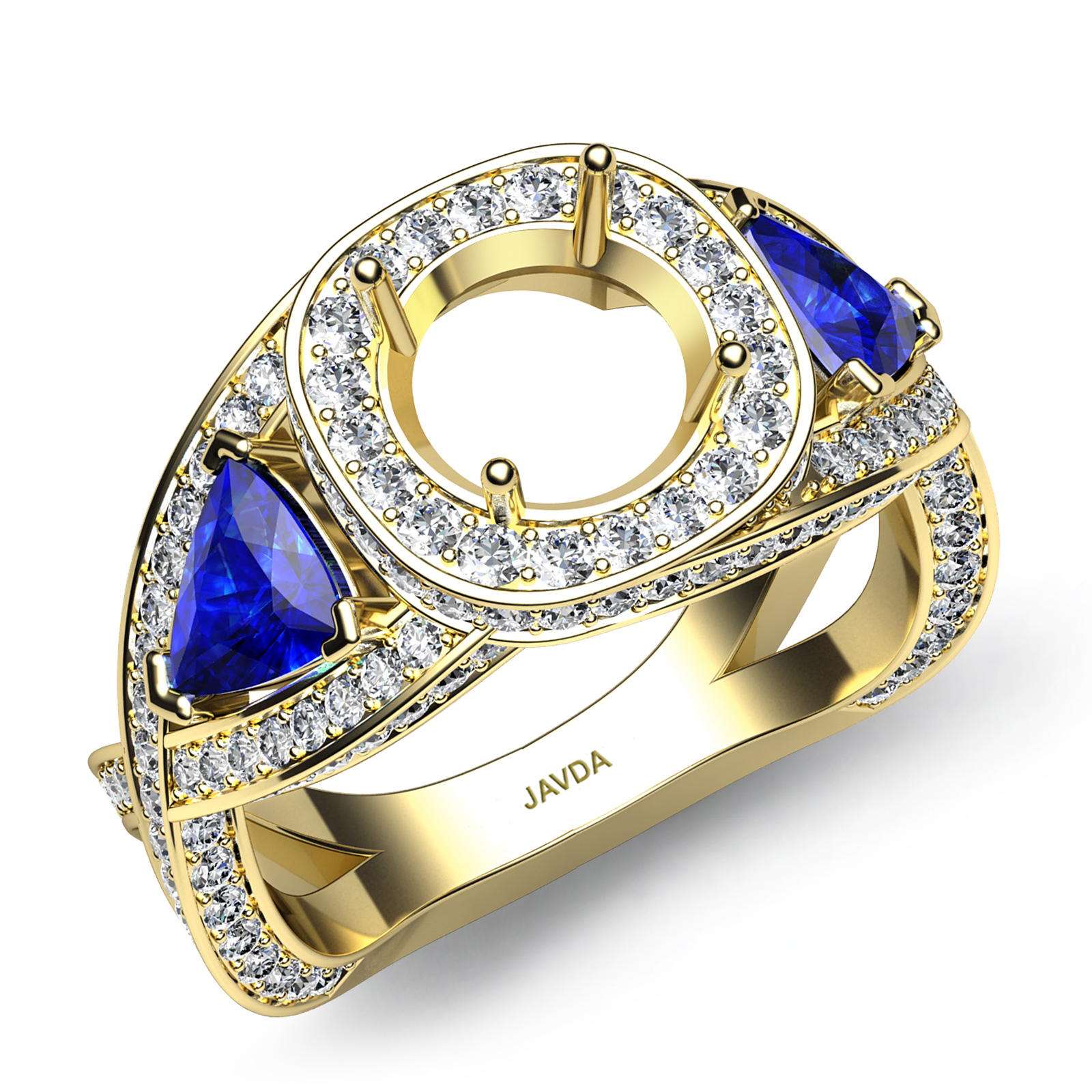 This beautiful three stone engagement ring made in 18k Gold Yellow. . of round diamonds frame the semi mount round diamond halo & the shank, surrounding the