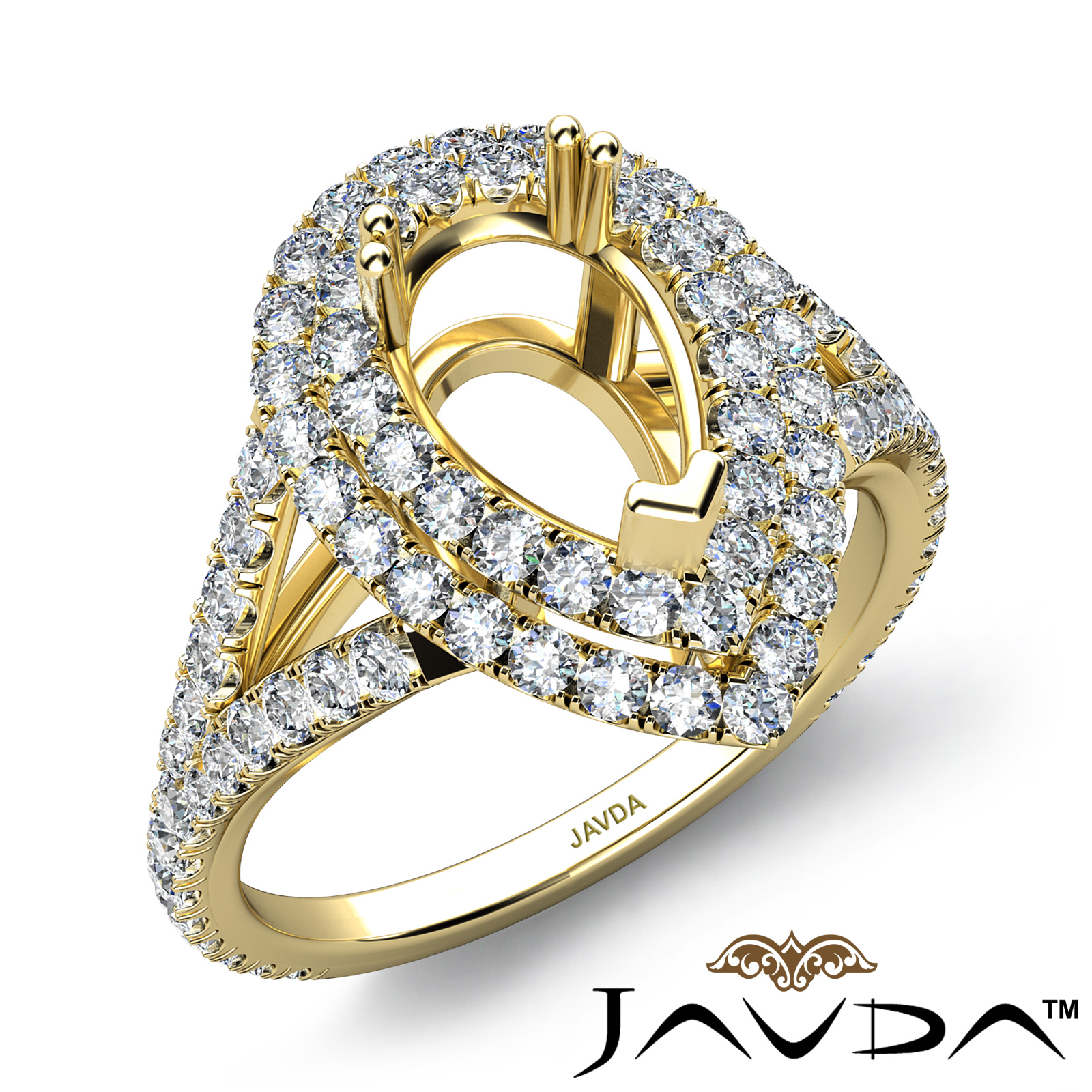 This Splendid diamond engagement ring is made in glorious 18k Gold Yellow. This pear cut semi mount ring features . round diamonds in U Split Cut setting on double halo & on the split shank shank. It weights 6 grams (1.5Ct. tw.)