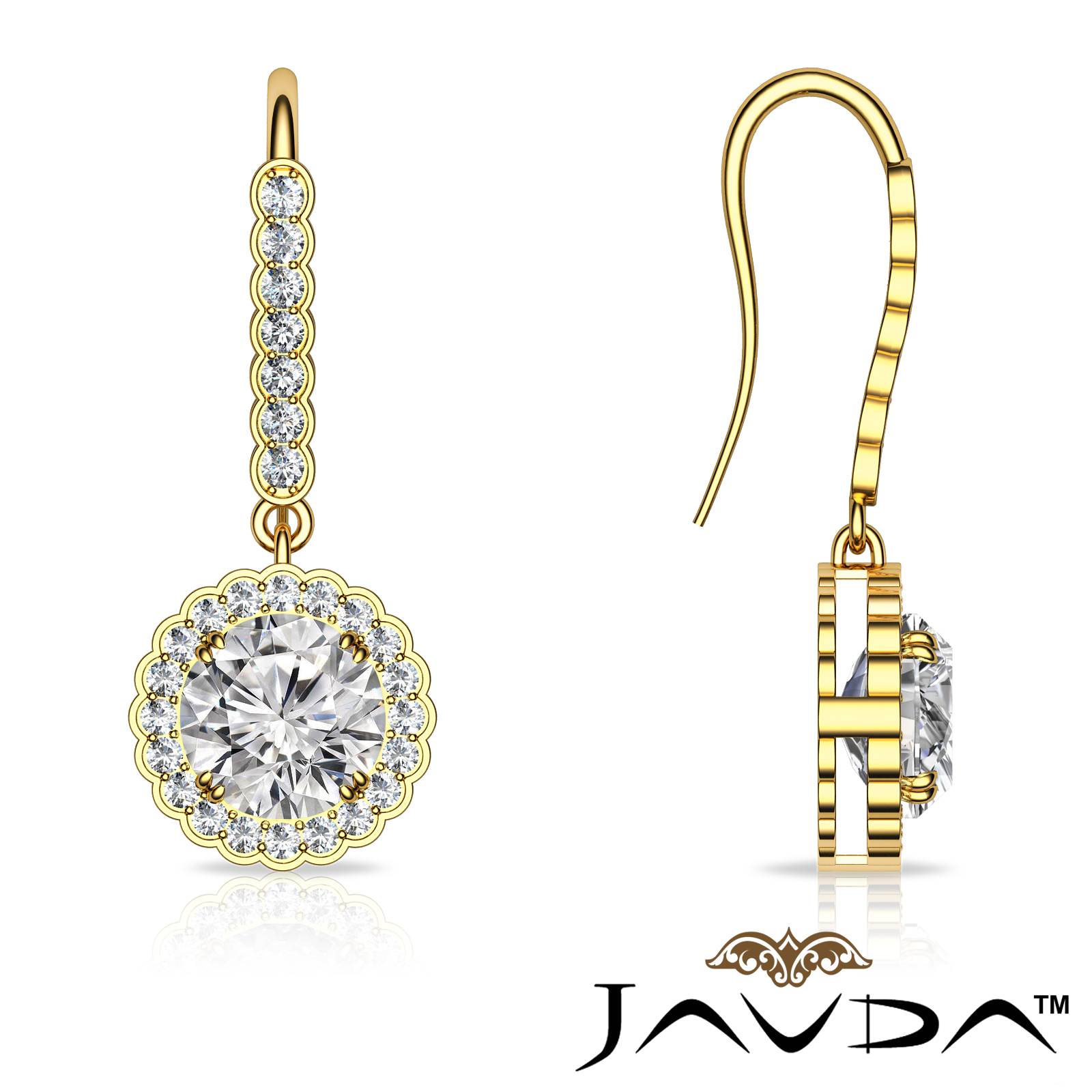 This beautiful vintage style, these 14k Gold Yellow earrings feature an appealing drop design. A magnificent round center diamond in prong setting. Sparkling accent diamonds are halo pave set around the center stone and the shepherd hook for added brilliance. The round drop earrings total carat weight is . (1.16Ct. tw.)