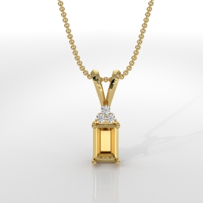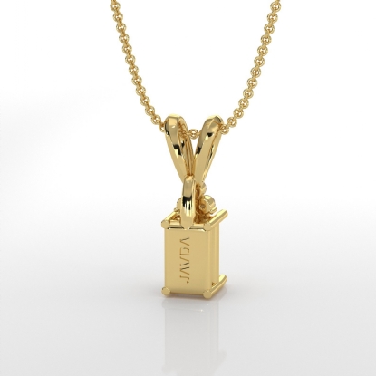 This splendid double bail prong set semi mount pendant is crafted in 18k Gold Yellow. Designed for an emerald cut center stone (not included), it offers timeless elegance. Accented with round brilliant diamonds in a secure prong setting. Pendant includes a matching chain and showcases expert craftsmanship. The width of the pendant measures approximately 2/16 inches.