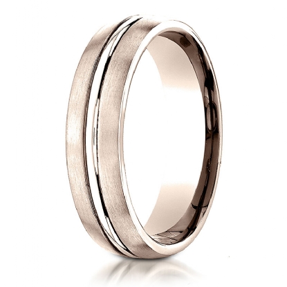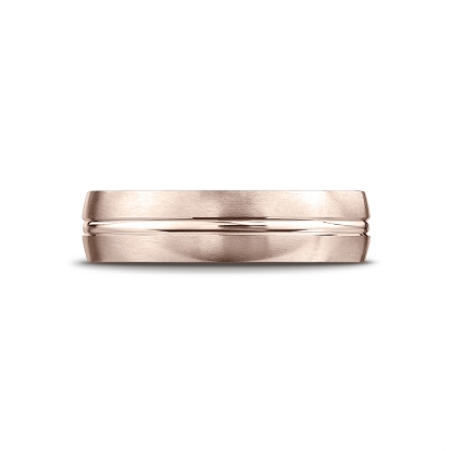 An elegant 6mm satin finished comfort fit carved center groove unisex wedding band. This ring features strong vertical grooves along the center for a refined, industrial look. Made from high polished 14k Rose Gold for both men and women. Available in white gold, yellow gold and rose gold.