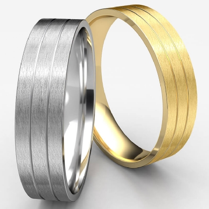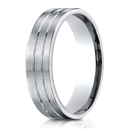 Comfort fit satin finish carved design men's wedding band made from high polished 14k Gold White. This 6mm ring features two horizontal parallel grooves along the center of the ring for a continuous pattern of style. Available in white gold, yellow gold and rose gold.