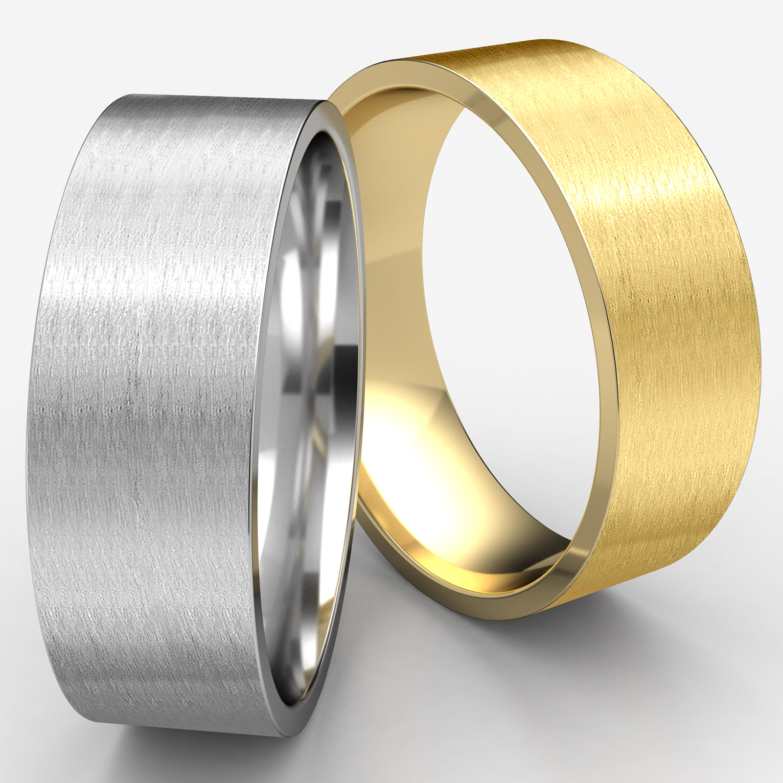 Classic 8mm satin finished flat design comfort fit wedding band for men. Made from 14k Gold White and quality craftsmanship makes this long lasting band a great value. The bold width and comfort fit interior creates an unique style. Available in white gold, yellow gold and rose gold.