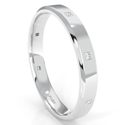 The classic & sleek men's diamond eternity wedding band is made from 18k Gold White. Showcasing thin polished finished band with princess diamond set in a bezel setting.