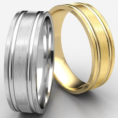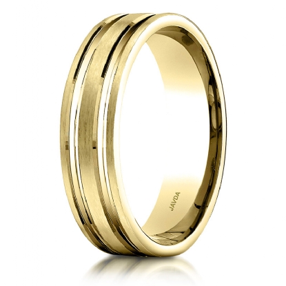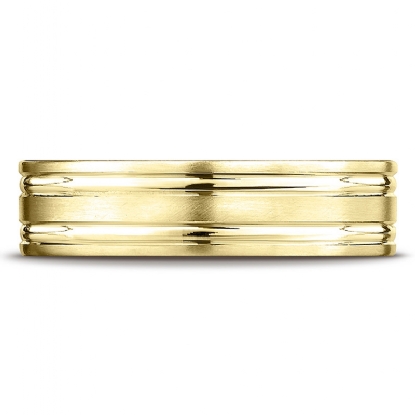This comfort fit satin finished carved design band is made for both men's and women's. Features two high polished parallel grooves and stripes along the center. Made from 14k white gold and measures 6mm wide. The quality comfort fit 14k Gold Yellow wedding band is long lasting and perfect for everyday wear. Available in white gold, yellow gold and rose gold.