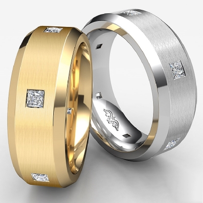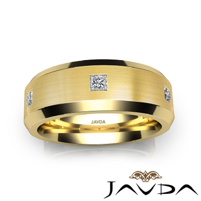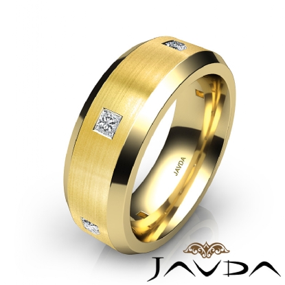 Classic matte finish men's diamond eternity wedding band is made from 14k Gold Yellow. Showcasing polished beveled edge and matte finished center with 6 princess cut diamonds in a bezel setting.