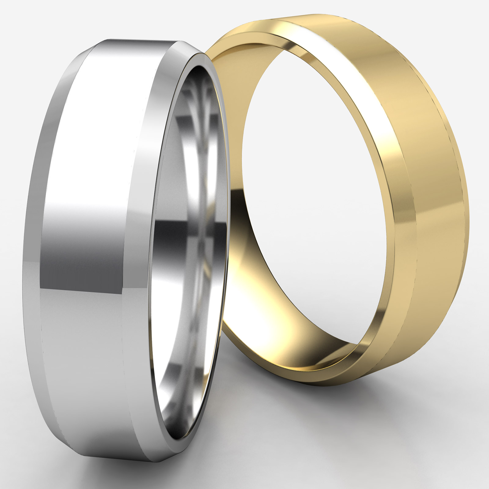 This comfort fit men's wedding band features satin finished center and high polish beveled edges. The perfect modern and classy combination of mens wedding band. Made from 14k Gold White and measures 7mm wide. Available in white gold, yellow gold and rose gold.